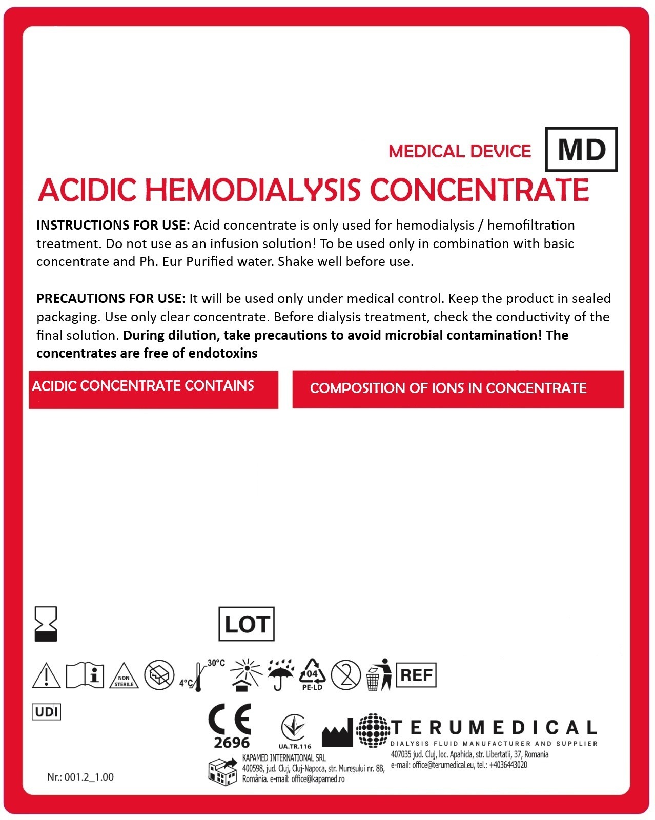 Acidic hemodialysis concentrate TERUSOL is used in extracorporeal dialysis with sodium bicarbonate. Acidic concentrate for hemodialysis is the major component of the system designed for hemodialysis. Only used in combination with purified hemodialysis water and Basic hemodialysis concentrate to prevent inflammation during treatment.